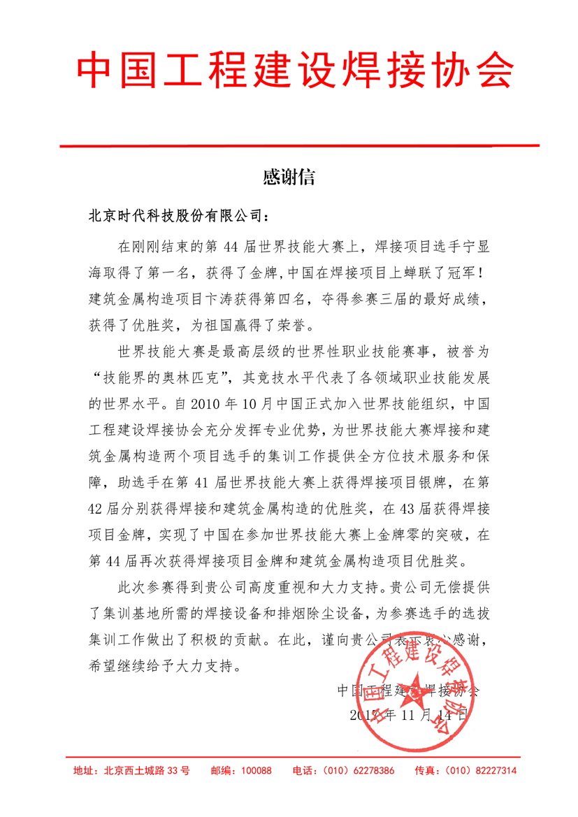 中國工程建設(shè)焊接協(xié)會感謝時(shí)代焊機(jī)提供世賽培訓(xùn)用機(jī)